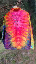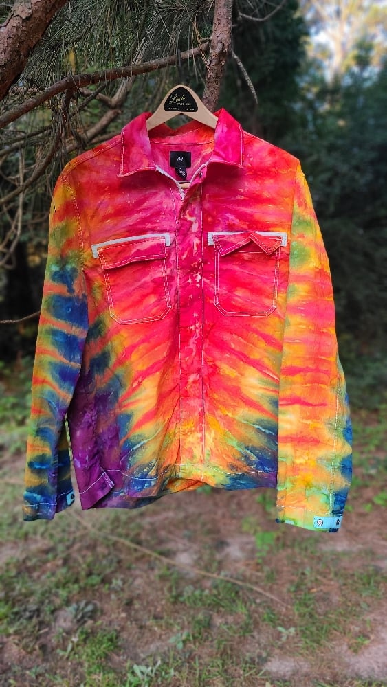 Built on utility, lit up with attitude—this overshirt is anything but ordinary. Vivid layers of scarlet, orange, yellow, and electric blue blaze across the fabric in a tiedye burst that refuses to fade into the background. A classic workwear silhouette meets a riot of color, creating a piece that’s as functional as it is fearless.