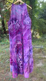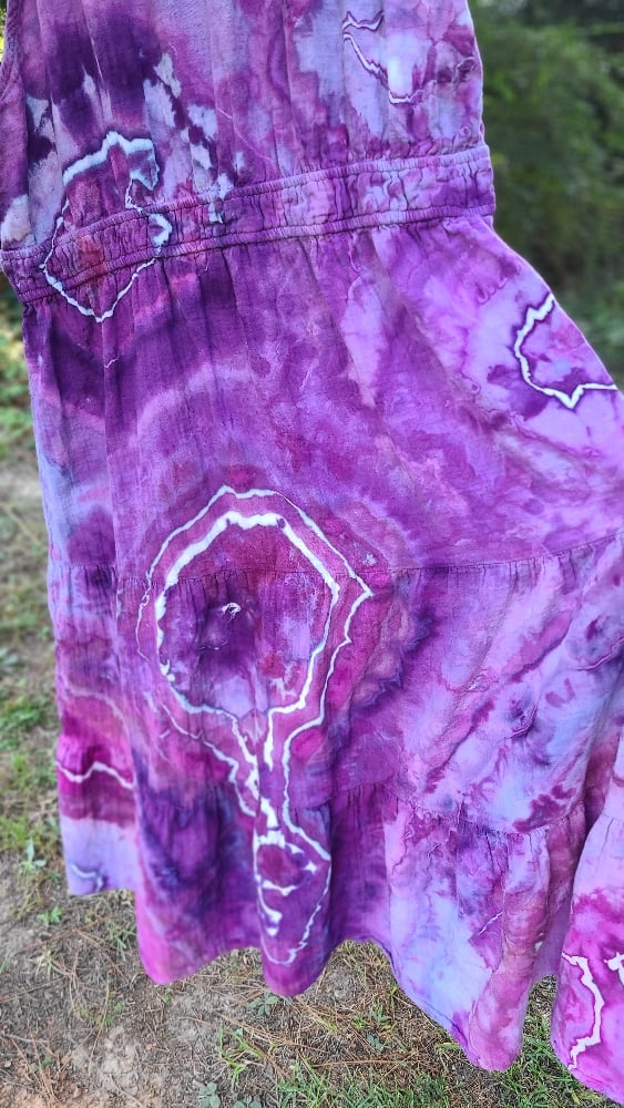 Like twilight painted across stone, Amethyst glows with layers of violet, plum, and rose—soft, luminous shades that shift as if lit from within. This one-of-a-kind maxi dress is dyed with the depth and mystery of geodes cracked open, revealing hidden color and light.
