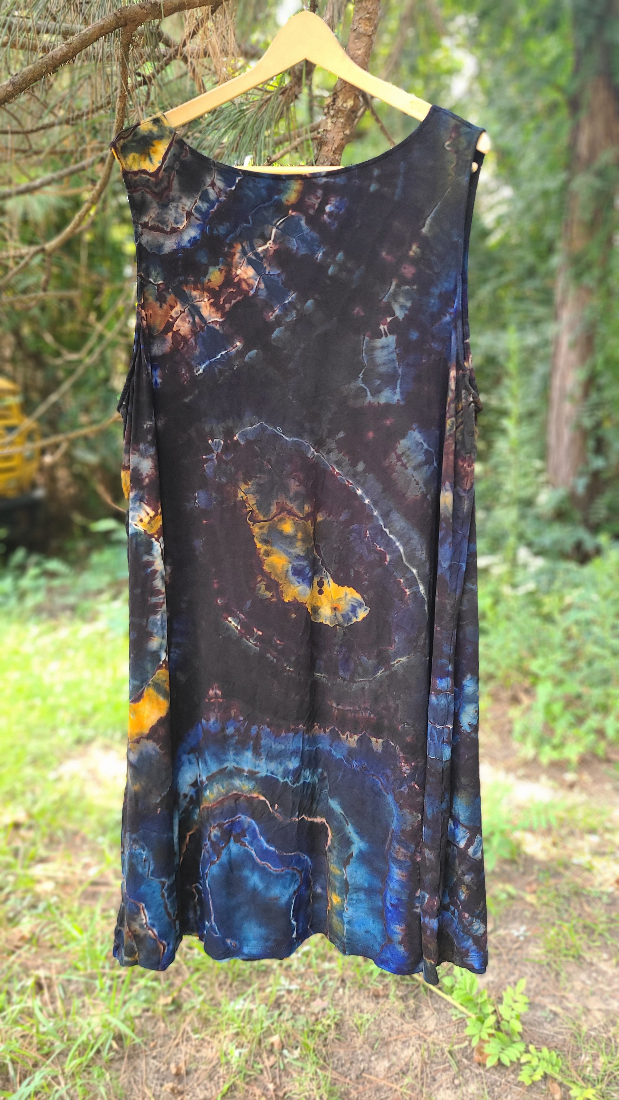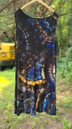 Mysterious and magnetic, Arcane channels the energy of a hidden cosmos. With its inky base cloaked in moody swirls of indigo, golden ember, and spectral violet, this dress feels like a portal—part stormy night sky, part ancient alchemy.