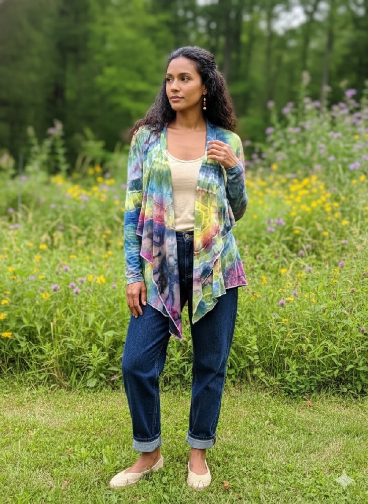 This cardigan is actually an XL but it runs small, so it fits more like a Medium/Large. Made of 90% cotton and 10% rayon; hand dyed with fiber reactive dye.