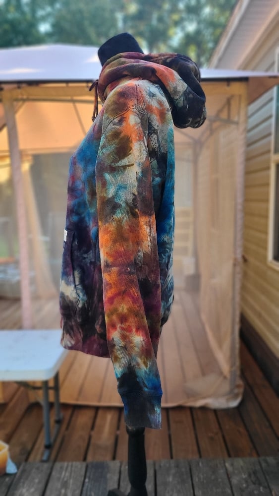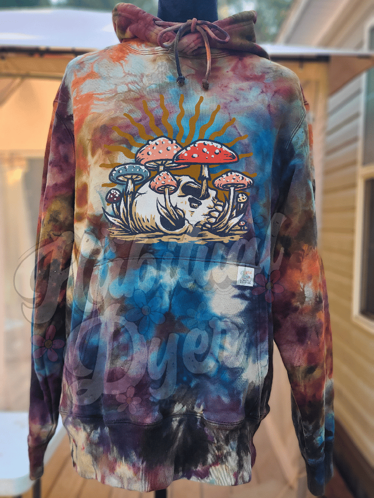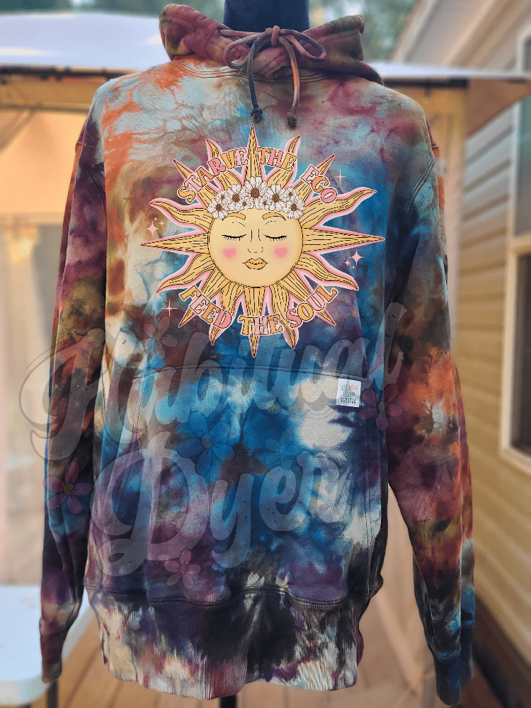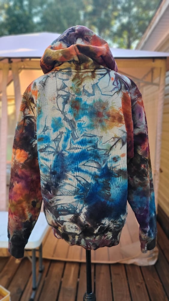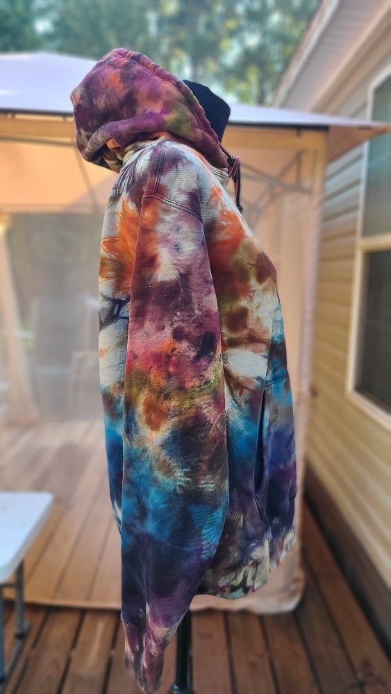 Autumn is a wearable painting—burnt orange, ember red, twilight purple, and storm-swept blue colliding in a cascade of reverse-dyed depth.