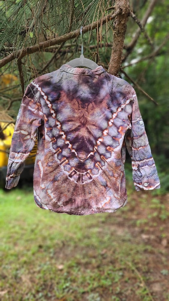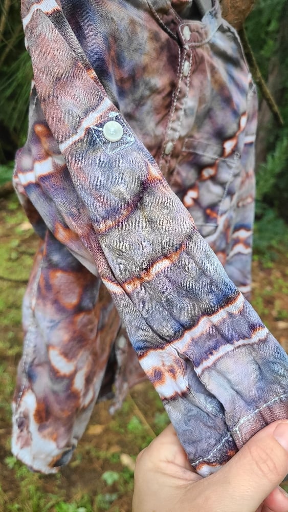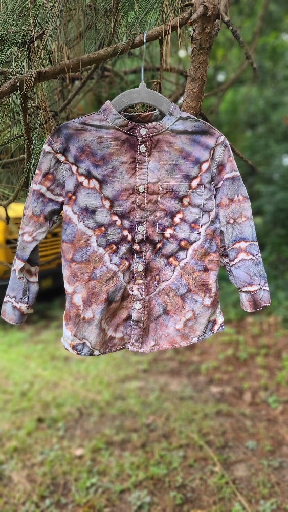 Made from breathable woven cotton, this shirt showcases hand-dyed swirls in shades of cocoa brown, smoky gray, and warm copper — a one-of-a-kind pattern that feels like autumn leaves drifting across a cloudy sky. The band collar and classic henley button-front add timeless detail, while the chest pocket brings a touch of practical sweetness.
