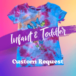 I have tons of different dye colors, so the options are endless. As far as tiedye style, my recommendations for infant sizes are spiral, scrunch, or geodes just because they are so small and have less surface area to work with. For toddler sizes, I can do a bit more.