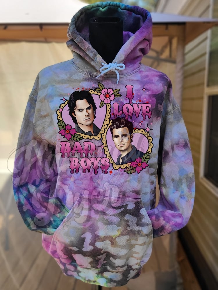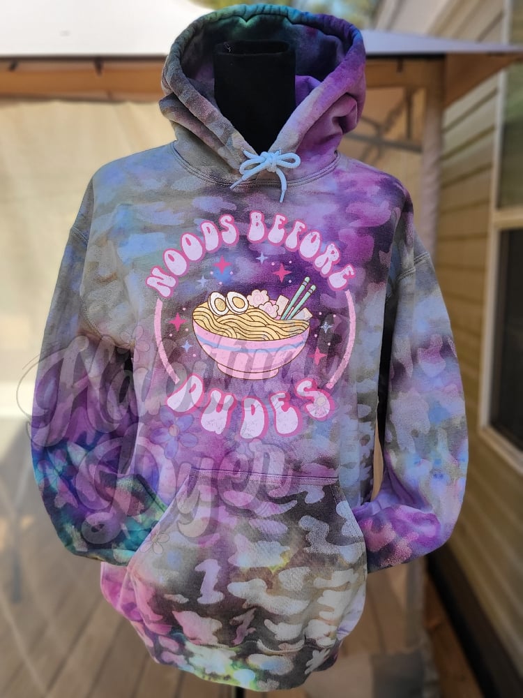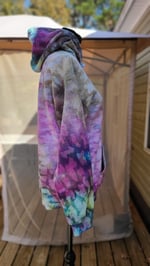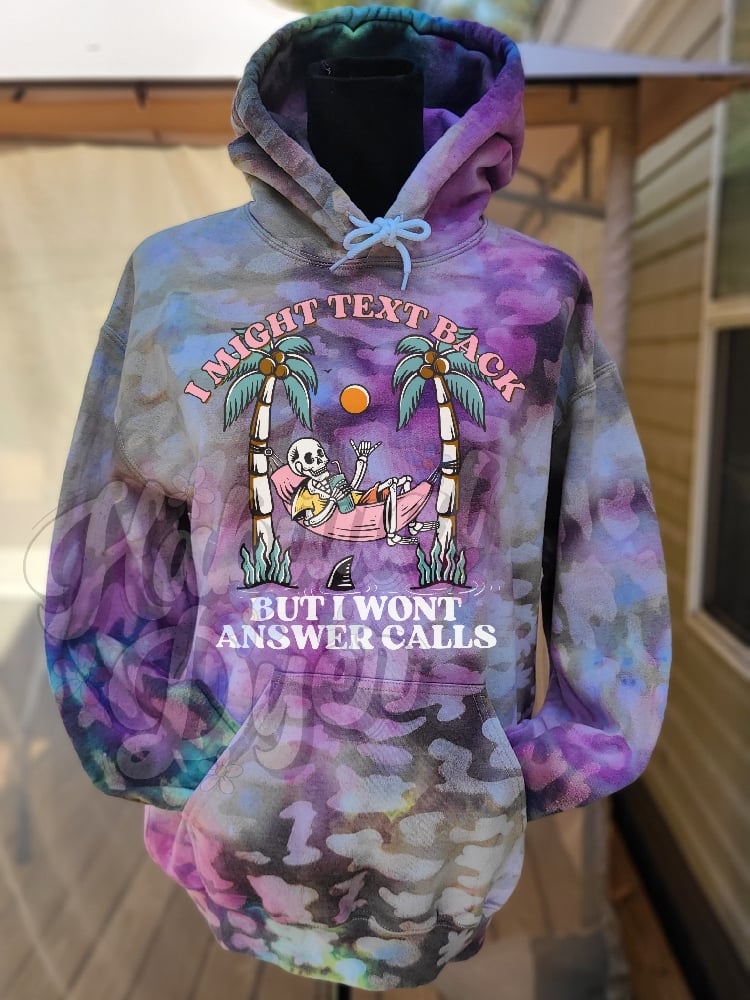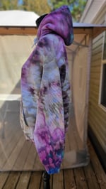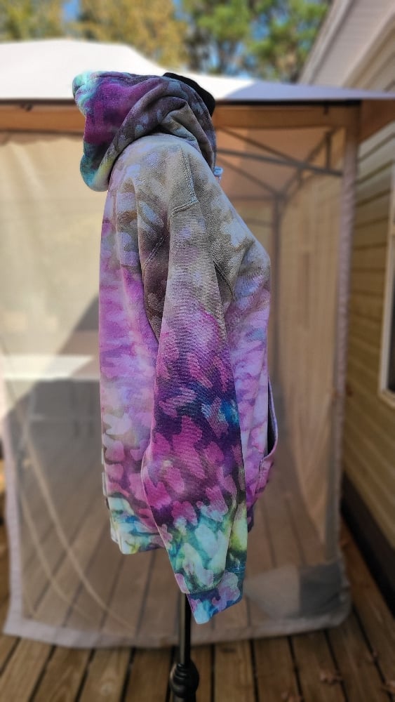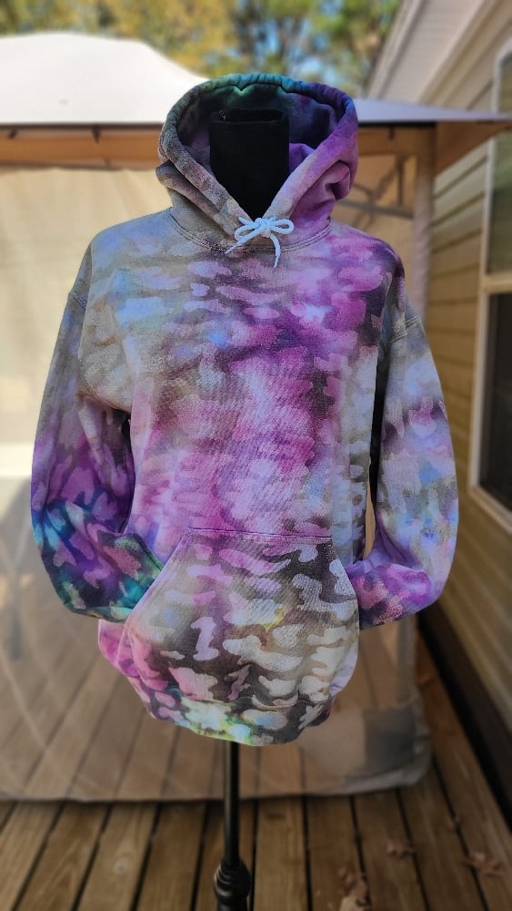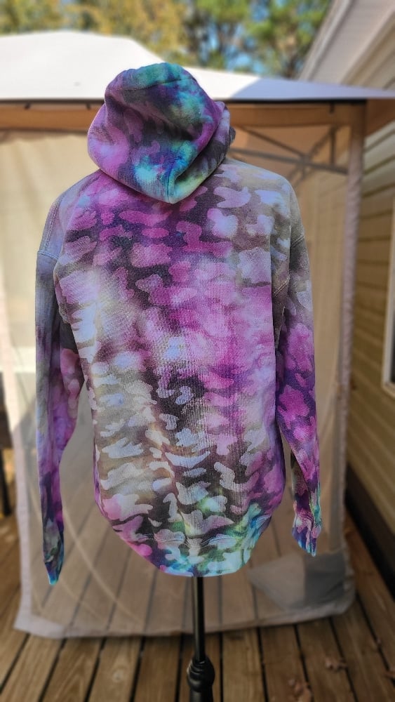 Unisex Medium 50/50 polycotton blend hoodie, ice dyed then bleach stenciled. Keep it plain or pick a print!