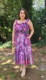 Like a meadow at golden hour, Elysian drapes you in soft blooms and twilight hues. This Torrid brand shirred-bodice midi dress is cut from breathable crinkle gauze rayon — light as a breeze yet opaque enough for everyday wear. The square neckline and ruffle trim with a dainty bow tie add a touch of romance, while adjustable straps and a smocked bodice offer a flexible, flattering fit. Hidden side pockets keep it practical without sacrificing charm.