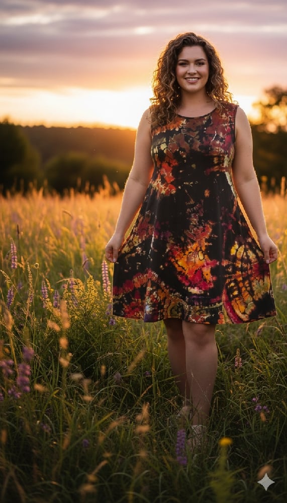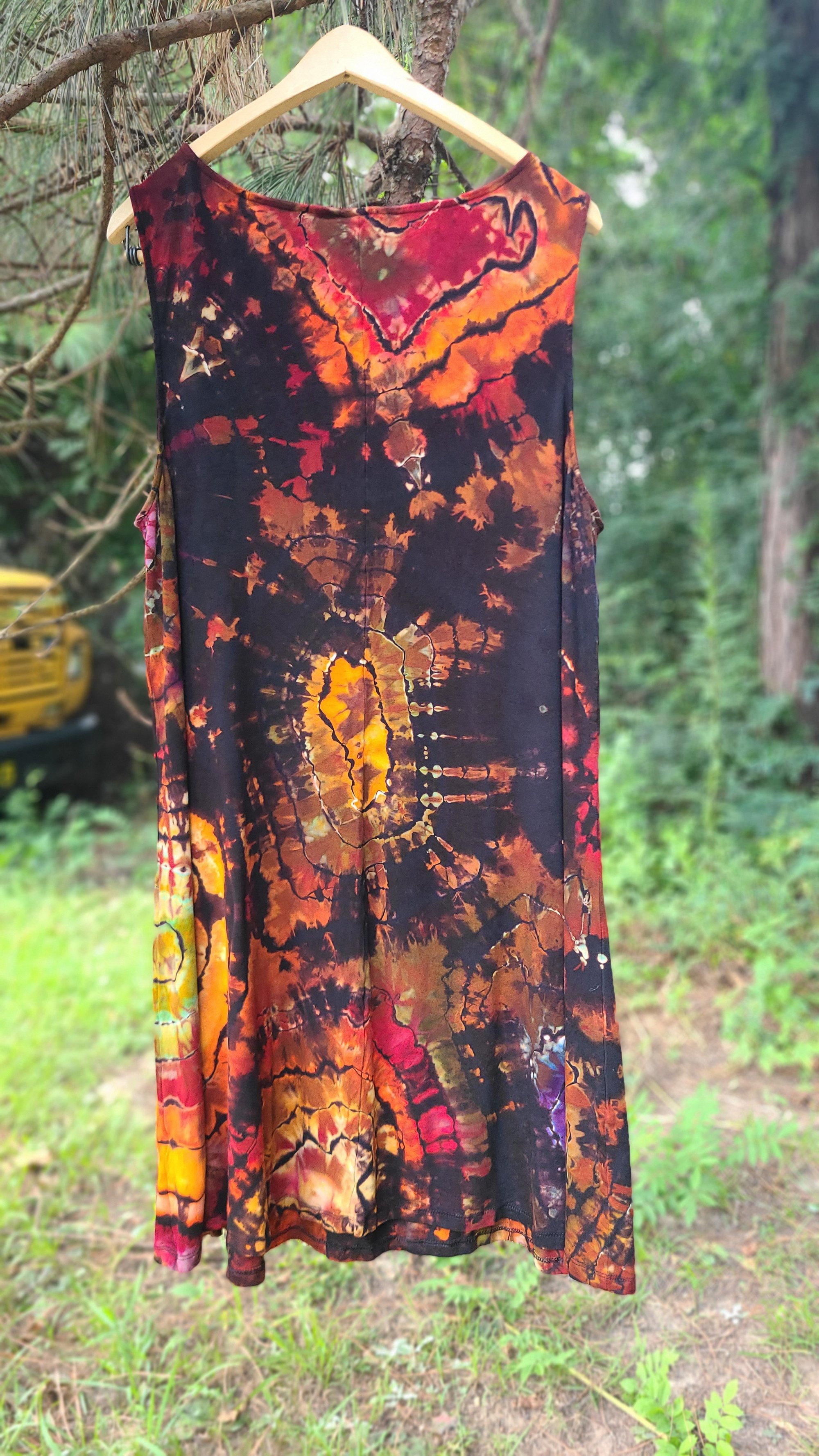 Bold. Elusive. Unforgettable. Enigma is a fire-lit mystery cloaked in molten color. With smoldering tones of ember red, burnt orange, goldenrod, and flashes of violet bursting across a black backdrop, this dress feels like lava meeting the cosmos—intense, alive, and unafraid to stand out.