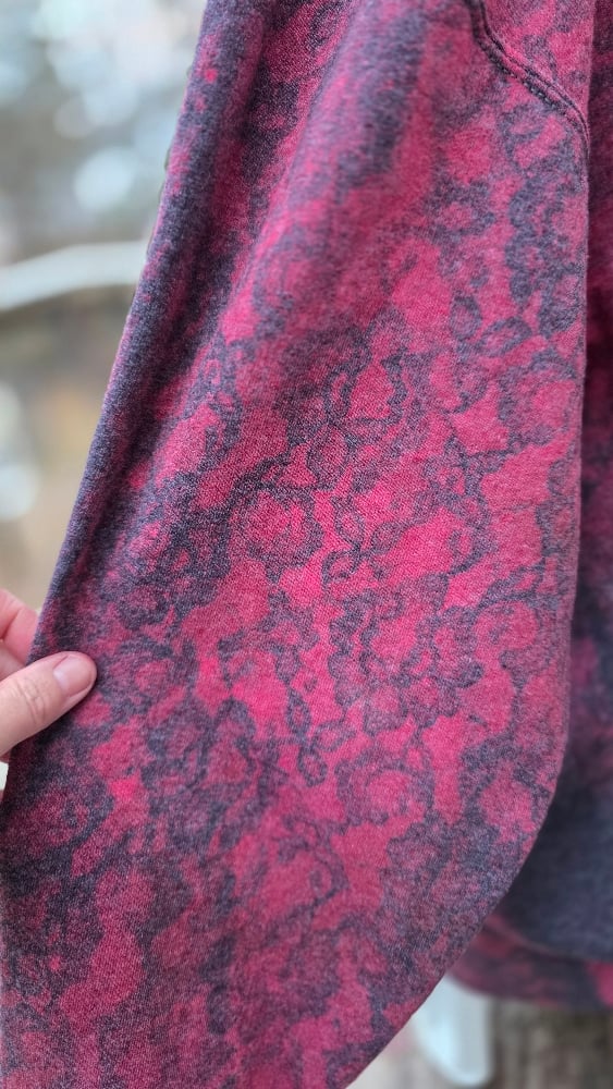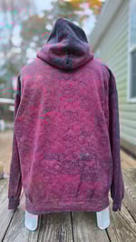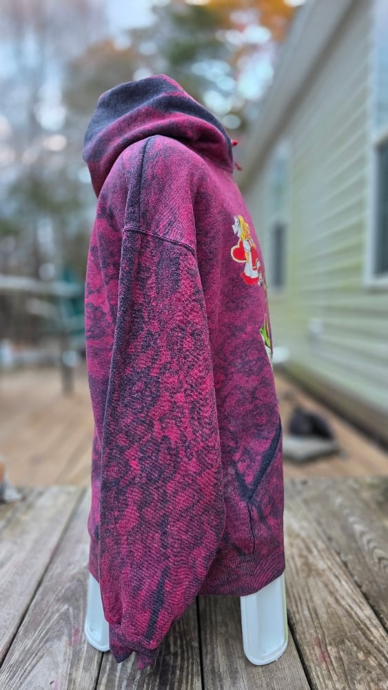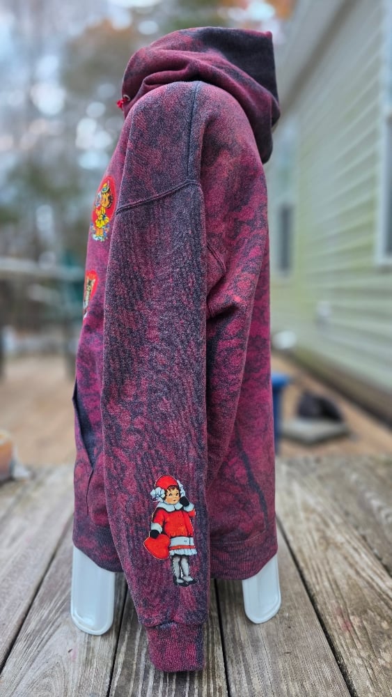 Fall in love with Ephemera Love, a wearable time capsule that blends moody, alt-aesthetics with sweet nostalgia. Starting as a charcoal base, this hoodie has been professionally reversed and over-dyed with rich red tones to create a complex, textured backdrop. It is finished with a curated collage of vintage-inspired "ephemera"—from classic valentine hearts and lace-trimmed lockets to charming kitsch illustrations that feel like they were pulled straight from a 90s scrapbook.