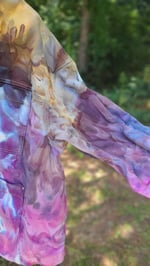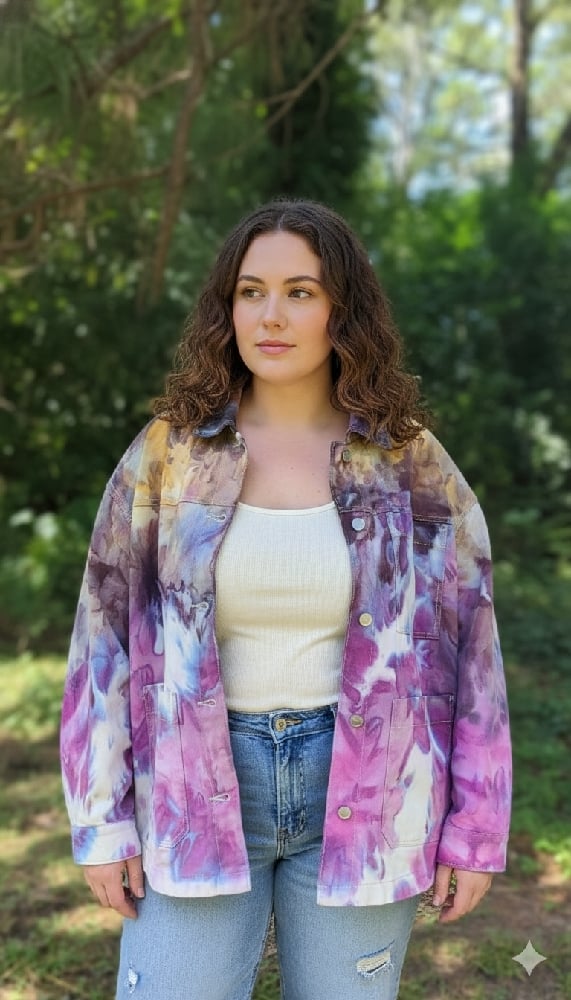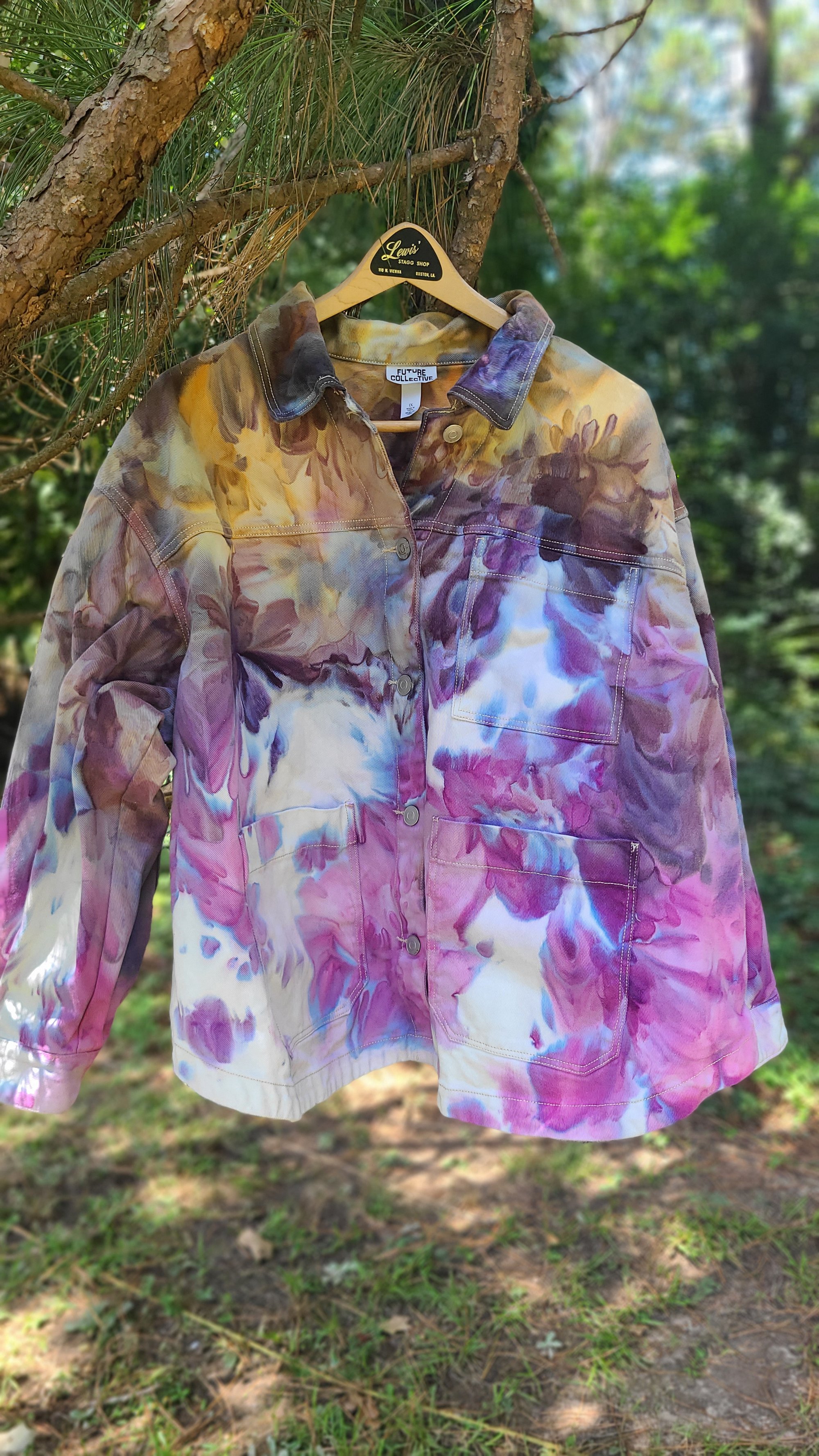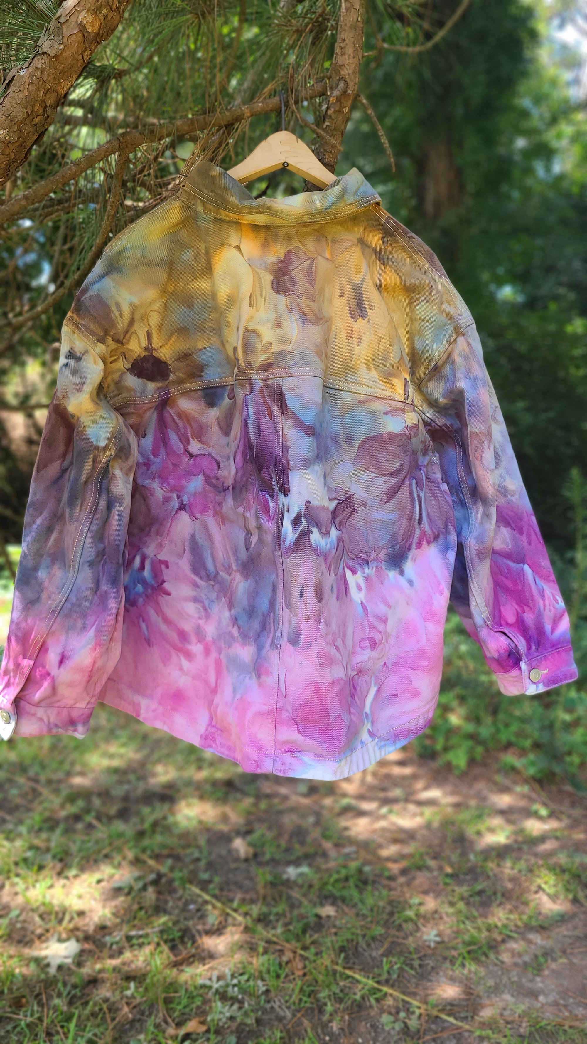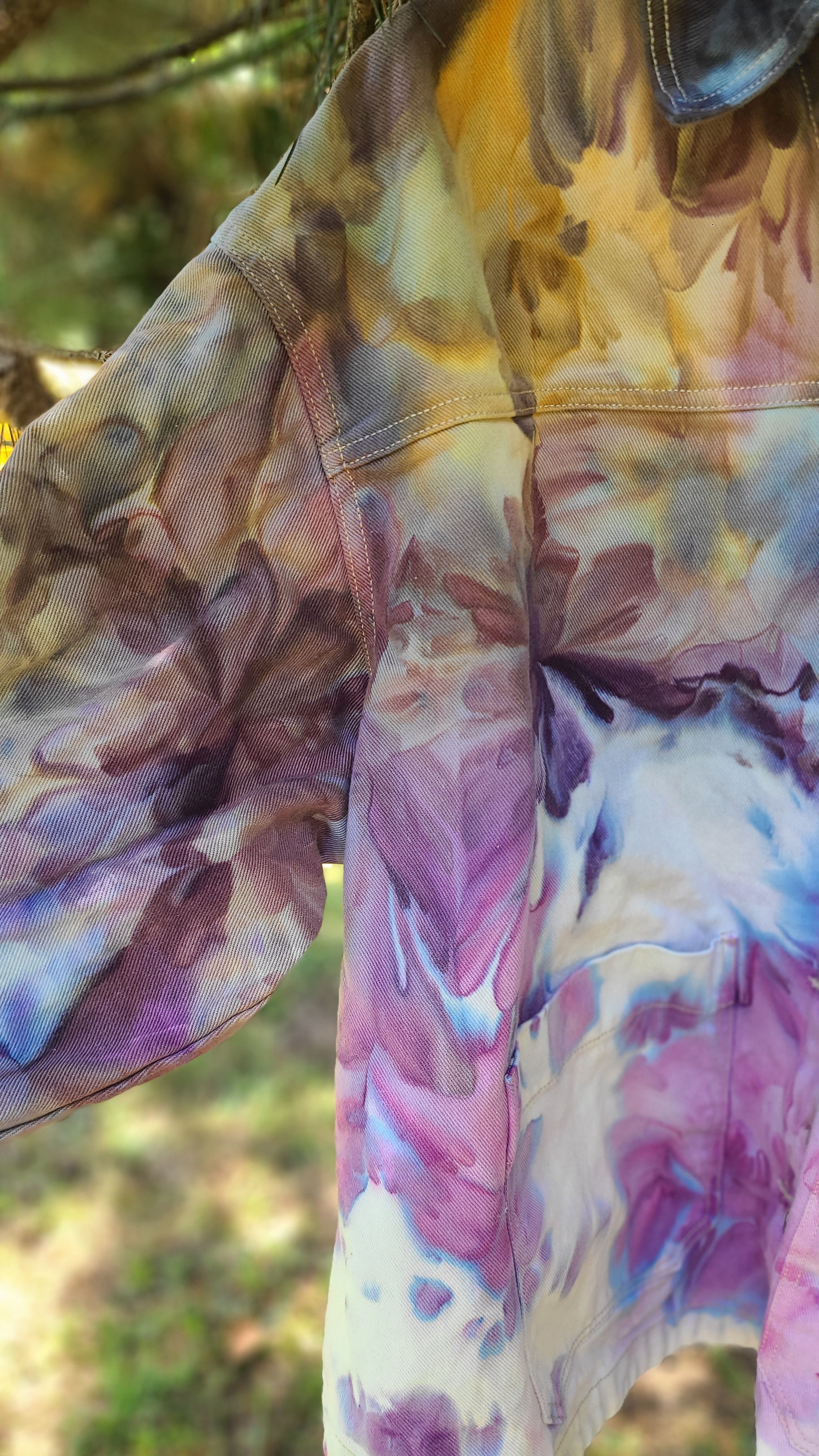 Chase the glow of Fool’s Gold, an oversized denim shacket alive with earthy golds, soft sands, and bursts of violet flame. Its painterly swirls capture the magic of sunlight spilling over wildflower fields—radiant, untamed, and one-of-a-kind.