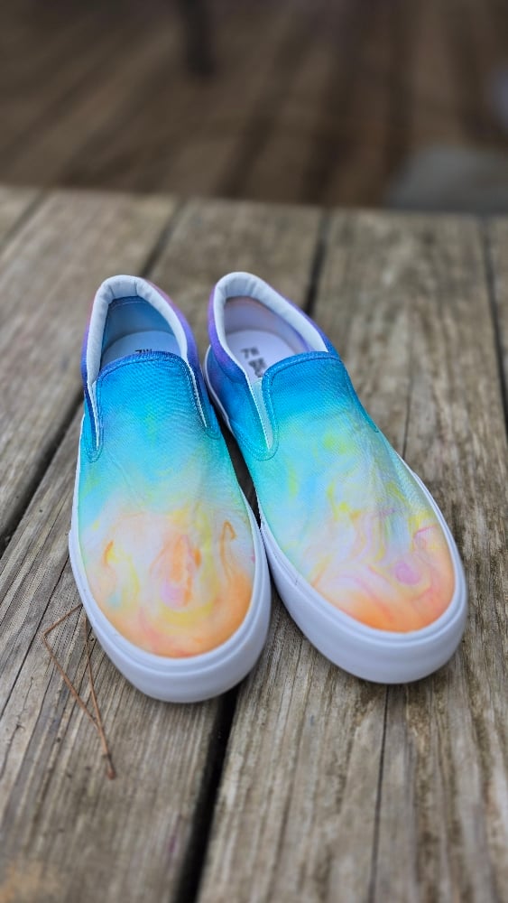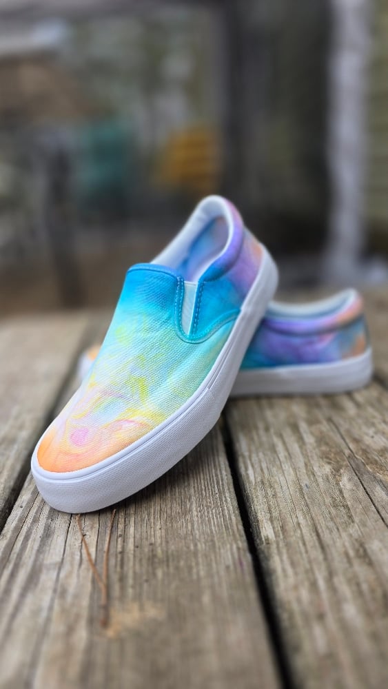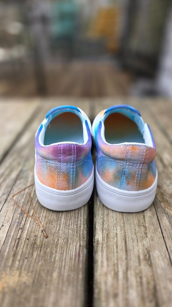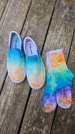Ladies Size 7W canvas slip-on shoes with matching socks, marble dyed with fiber reactive dye