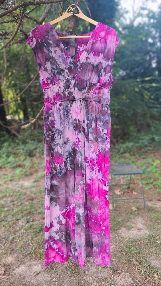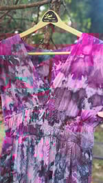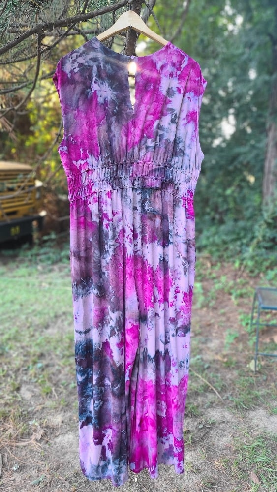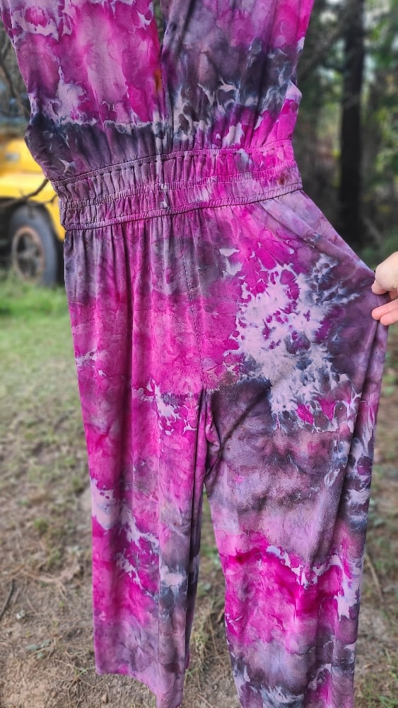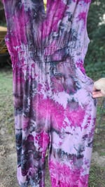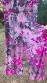 Sweet and striking, the Grape Jelly Jumpsuit is a one-and-done outfit that drapes like poetry in motion. Dyed in swirls of fuchsia, plum, and smoky undertones, this piece carries the richness of grape jelly with a bold, artistic twist.