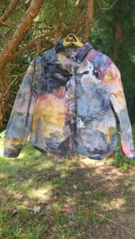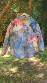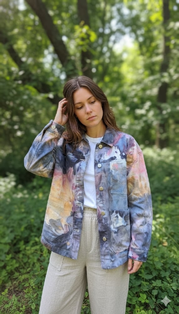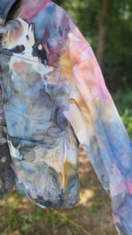 Where shadows meet light, Haunted Harmony was born. This oversized denim shacket carries an otherworldly beauty, hand-dyed in dusky washes of stormy gray, midnight blue, smoky lavender, and flickers of golden flame. The colors swirl together like twilight skies touched by candlelight—haunting yet harmonious, bold yet softly wearable.