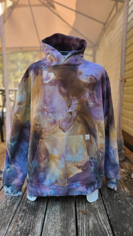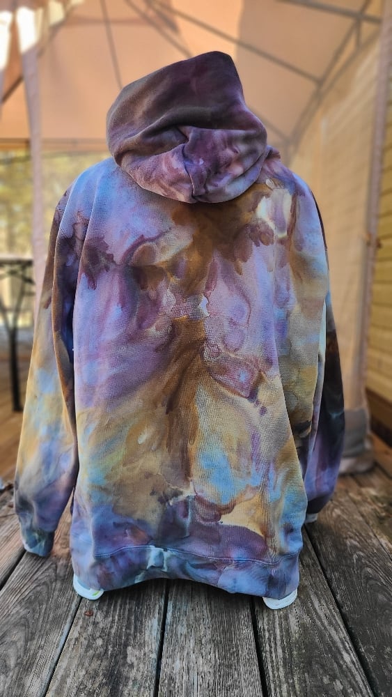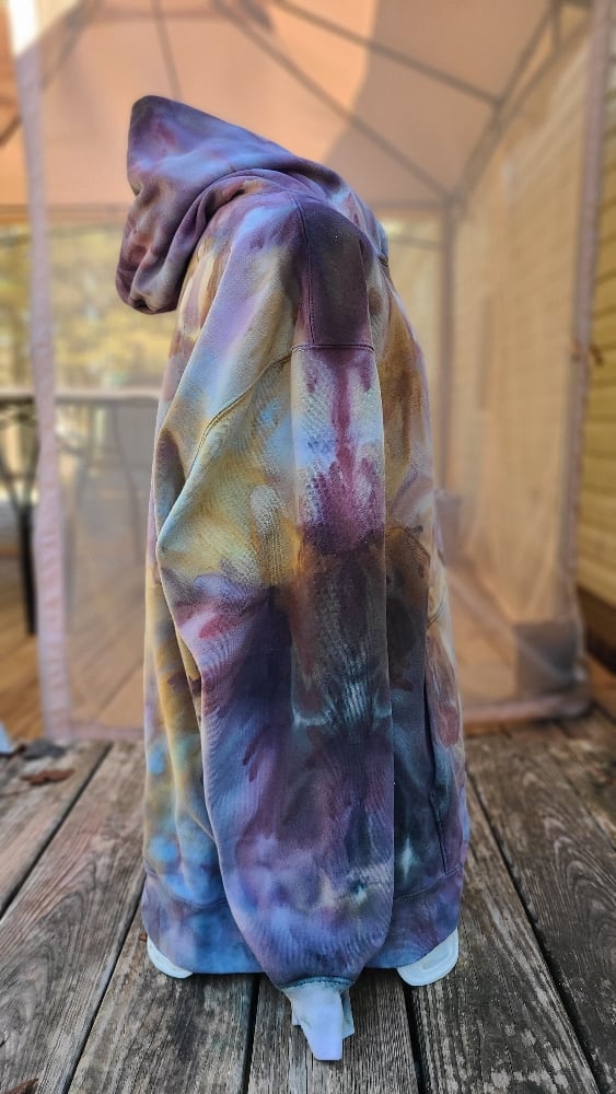 Moody, grounded, and unmistakably powerful — Heavy Metal channels the raw beauty of a brewing storm. Swirls of charcoal, plum, bronze, steel blue, and soft gold melt into each other like shifting weather fronts, creating a marbled landscape of shadow and light. Each fold of the fabric captured its own metallic note, giving the hoodie a quiet, smoldering intensity that feels both earthy and atmospheric.