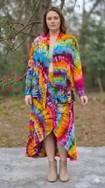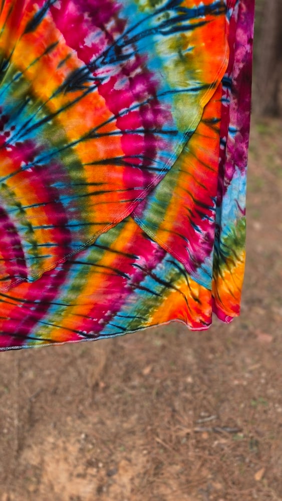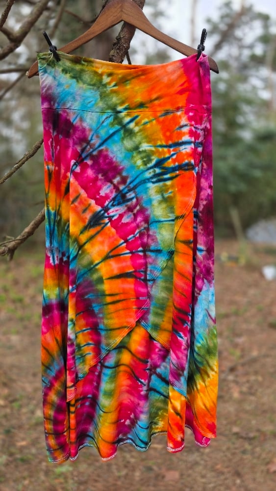 The showstopper of the set. This skirt features a flattering crossover front design that adds dimension and movement to the bold tiedye pattern.