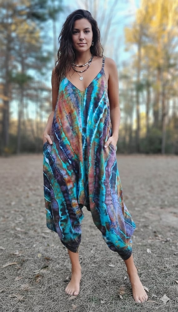 With its versatile one-size-fits-most design, the Hippie Trails jumper accommodates busts up to 50 inches, making it ideal for a variety of body types. Its bold tie-dye patterns and flowy silhouette make it a standout addition to any wardrobe. Dress it up or keep it casual—this jumper is the perfect companion for your next adventure.