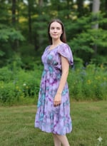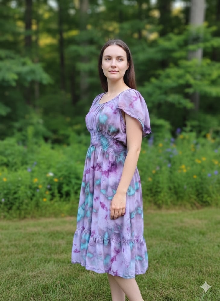 Wrap yourself in romance with the Lavender Lily, a 100% rayon dress designed to capture the free-spirited elegance of bohemian style. Hand-dyed in enchanting shades of purple and blue, this dress evokes the beauty of twilight blooms.