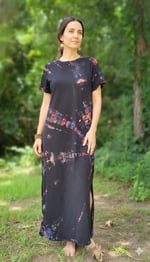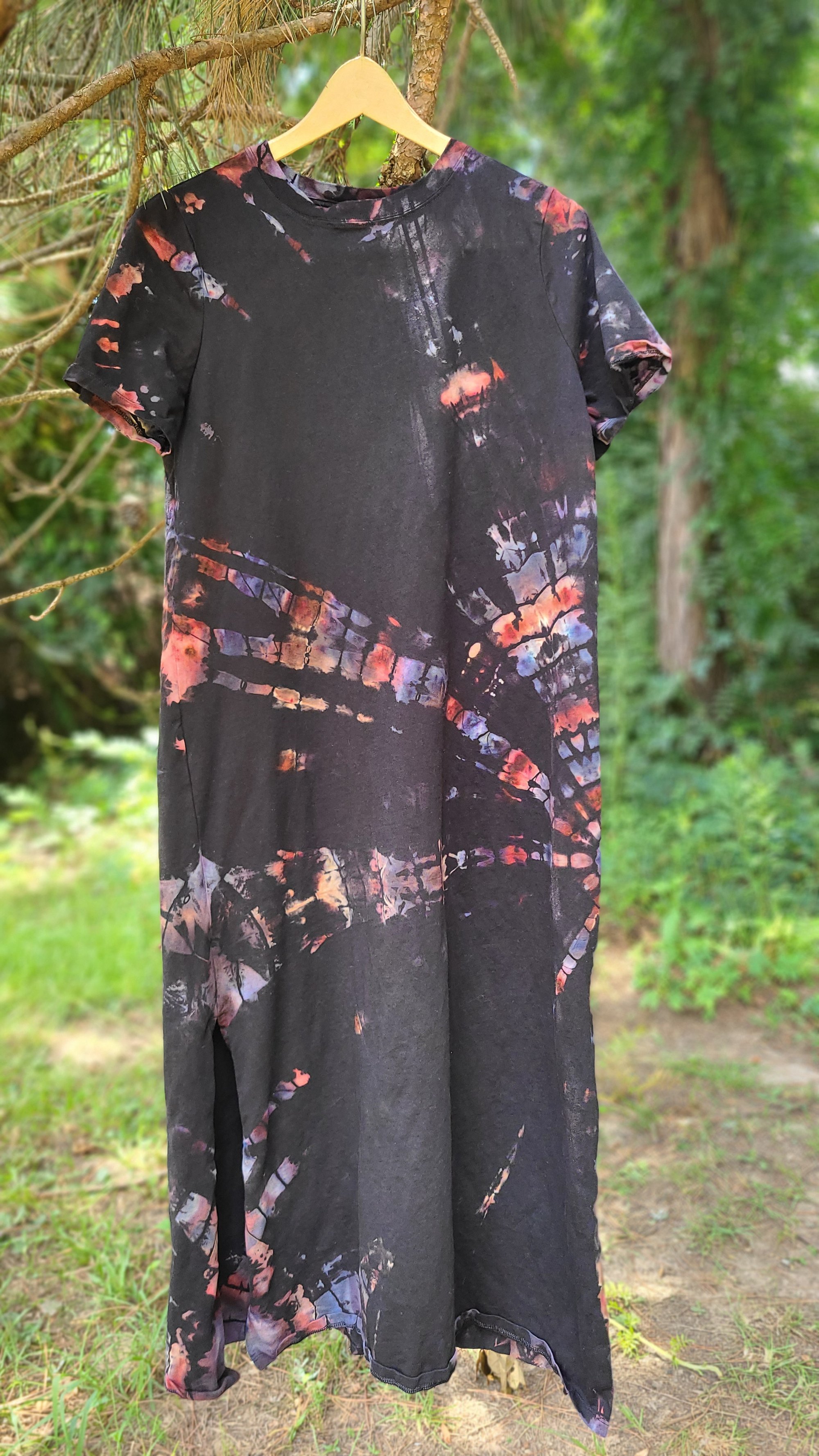 Let your light shine—especially when it’s wrapped in shadows. Light in the Darkness is a soft, slouchy statement piece that brings tiedye drama to an ultra-comfy classic. Crafted from 100% cotton jersey and hand-dyed with cosmic bursts of lavender, coral, and indigo against a blackened backdrop, this dress evokes stardust, smoky skies, and sparks of hope.