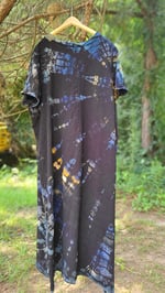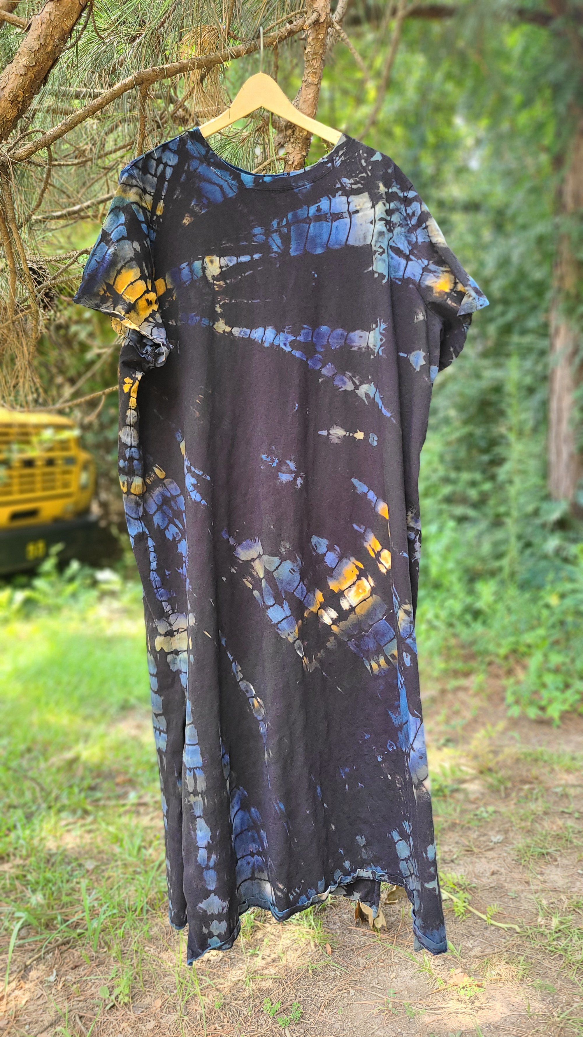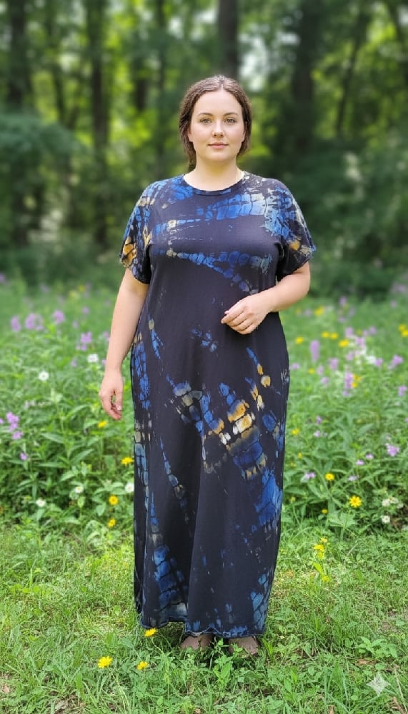 Muted Diffusion captures the quiet drama of shifting light through stormy skies. This vintage Old Navy maxi T-shirt dress wraps you in a darkly luminous palette—think midnight blue, charcoal, indigo, and soft bursts of gold—abstracted in a moody tiedye pattern that feels both celestial and grounded.