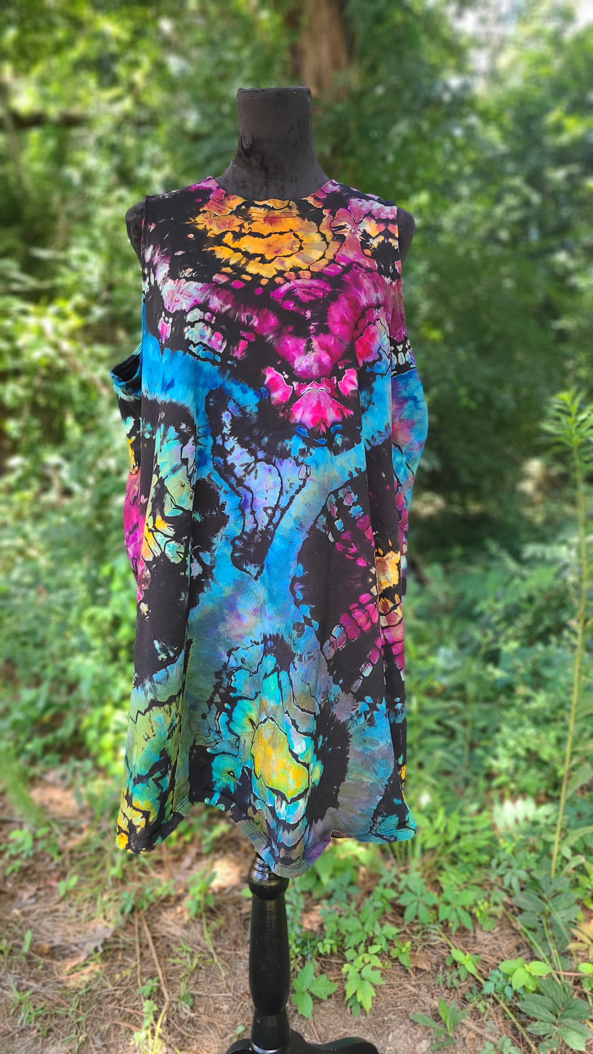 Unleash your inner spectrum with Oil Rock Rainbow, a vibrant mini tshirt dress that channels the prismatic beauty of oil-slick shimmer and raw gemstone energy. This Old Navy sleeveless favorite lights up in bold swirls of electric blue, neon yellow, magenta, and sunset orange—each hue rippling across a deep black canvas like a living work of art.