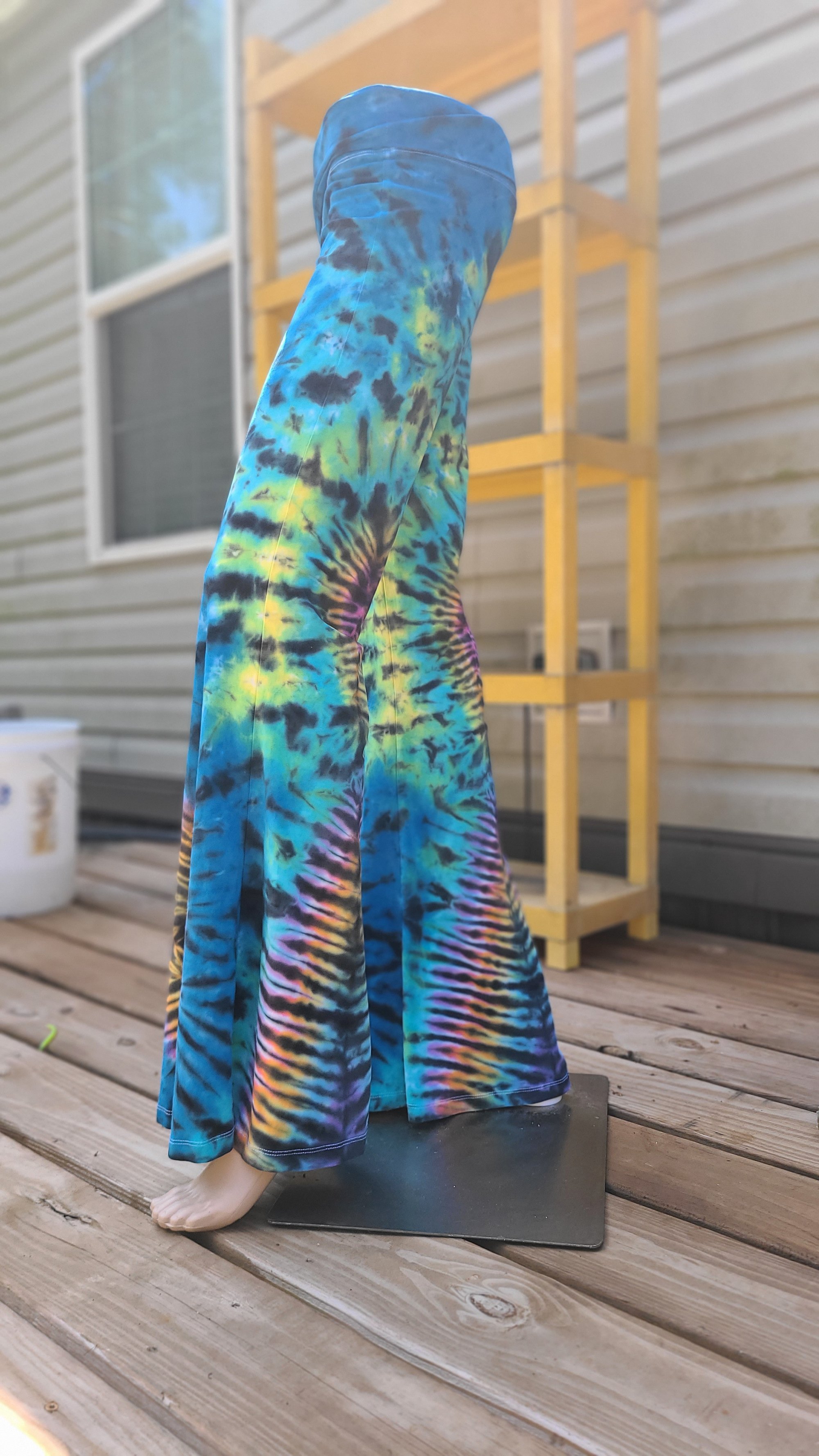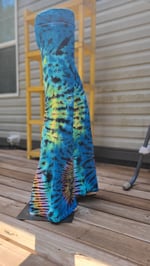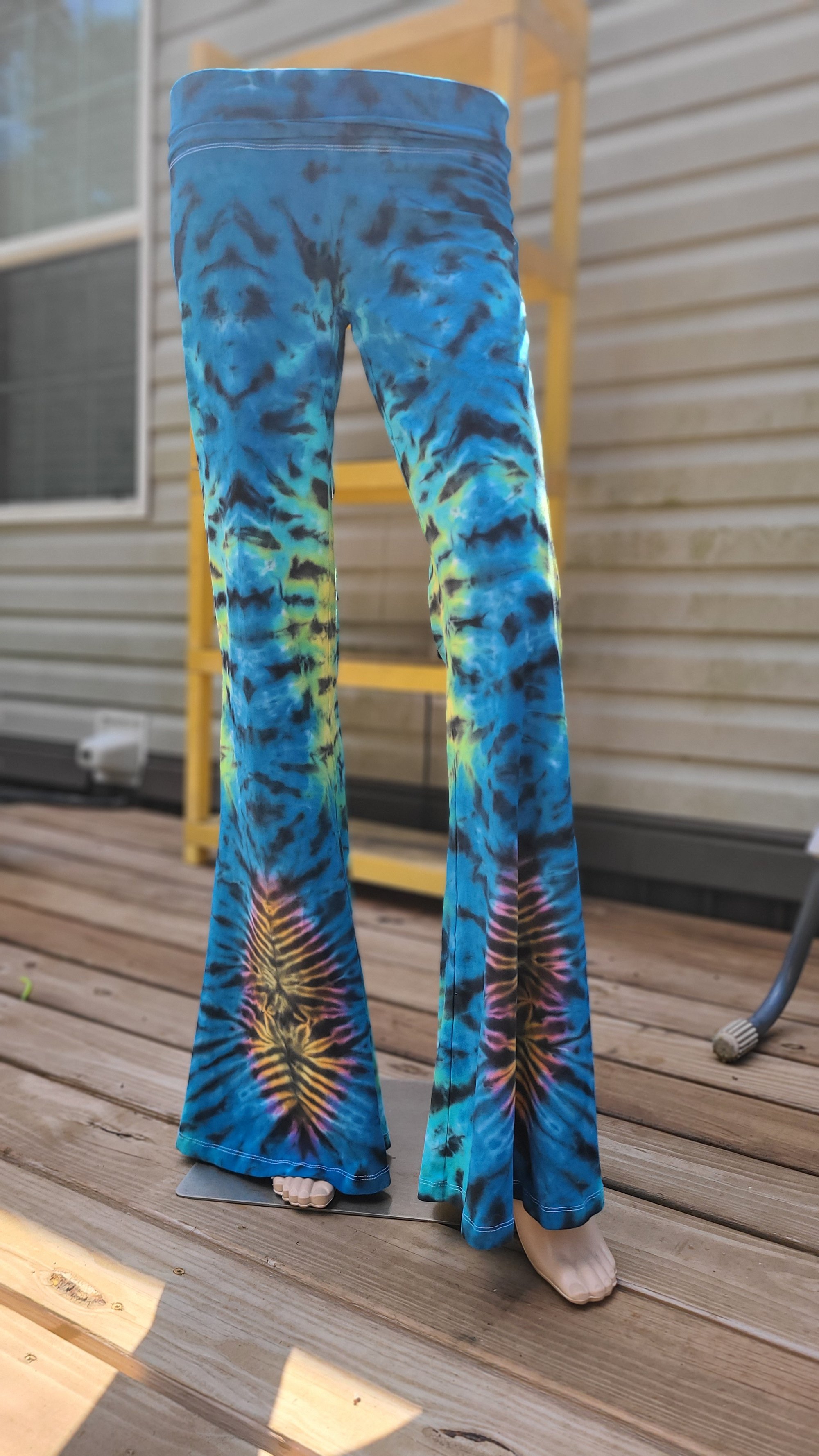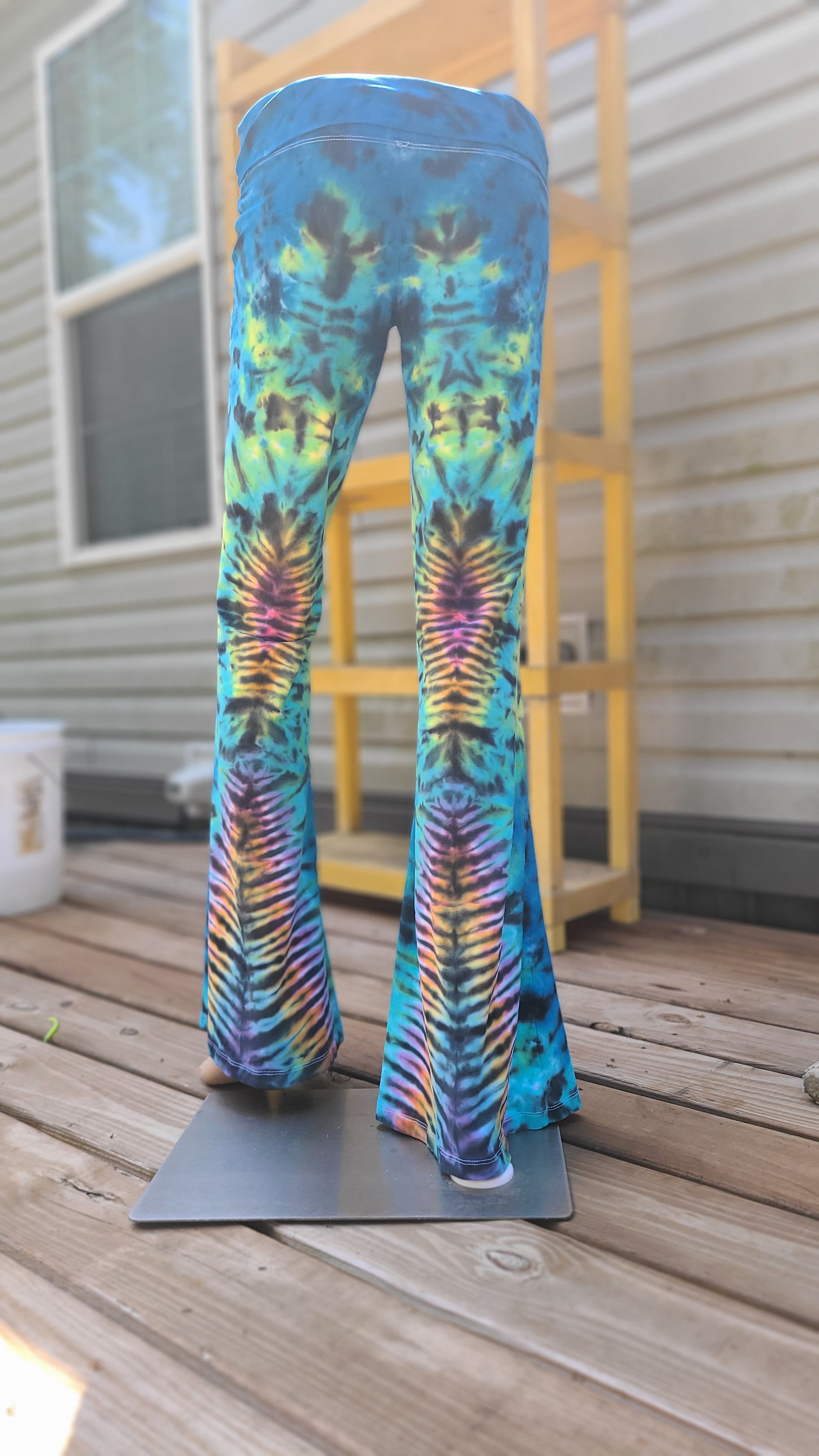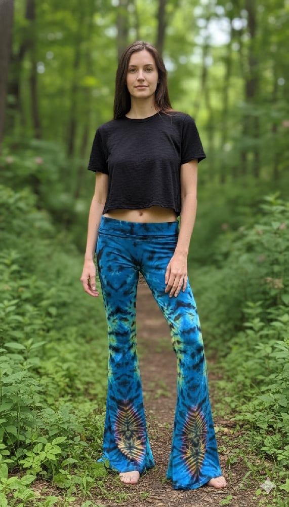 Hand-dyed in a mesmerizing palette of electric blue, jade green, and black with psychedelic rainbow bursts down the legs, these pants are pure festival magic. The flared bottoms feature a hypnotic V-stripe design that radiates retro energy with a modern twist.