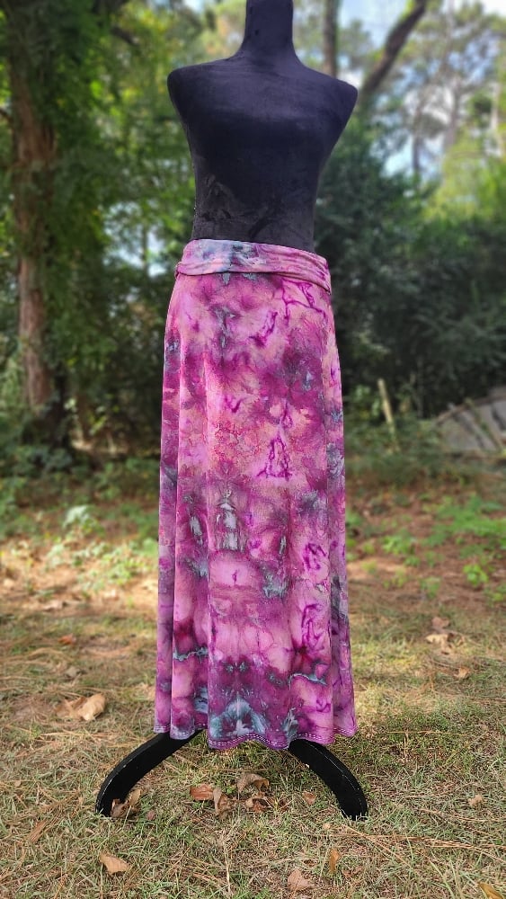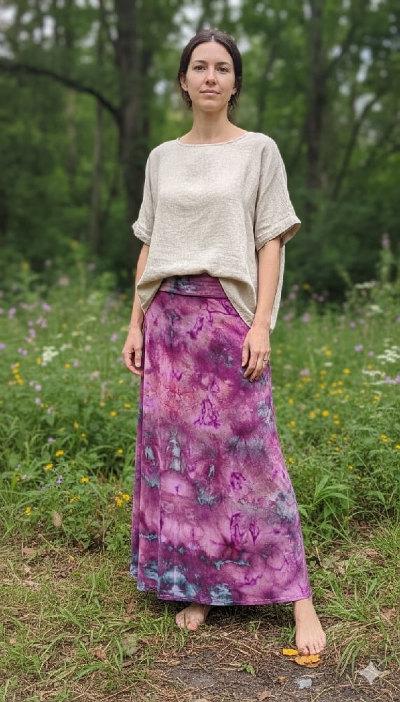 Mysterious and alluring, Phantom drapes the body in deep berry hues and smoky undertones, like twilight slipping through velvet shadows. Crafted from a luxuriously soft and stretchy rayon-spandex blend, this maxi skirt offers breathability and effortless movement. The high foldover waistband flatters your shape while allowing for a custom fit—wear it high or low, however the mood strikes. Elegant, fluid, and full of quiet power, Phantom moves like a whisper through the dusk.