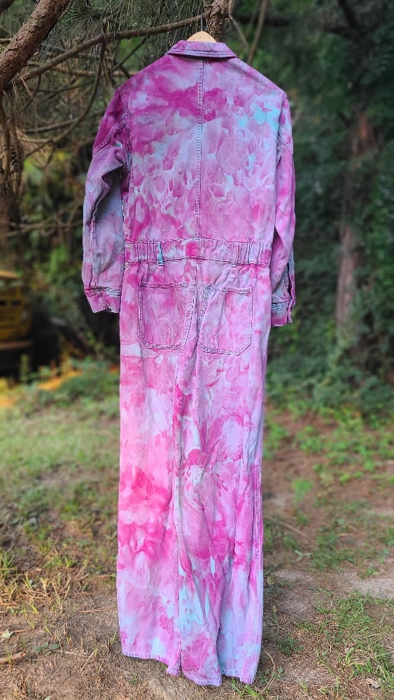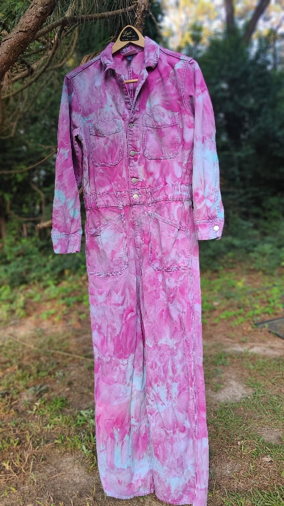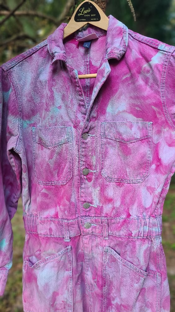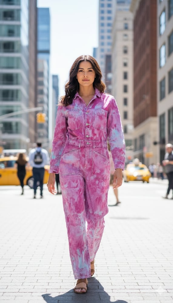 This Universal Thread coverall in Women’s size 8 is drenched in a hand-dyed blend of bubblegum pink, fuchsia rose, cotton-candy blush, and soft sky blue—a palette that feels equal parts statement and sweetness. Like a pledge sealed in color, it’s daring yet tender, a jumpsuit that promises to turn everyday into something memorable.