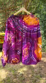 Dyed in radiant swirls of violet, amber, and magenta, this blouse feels like dawn breaking across your skin. A statement piece you can float through the day in, whether you’re layering it up or letting it shine on its own. 🌞✨