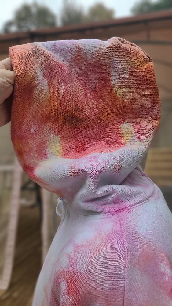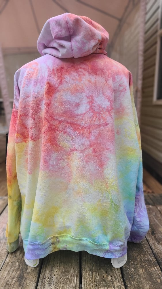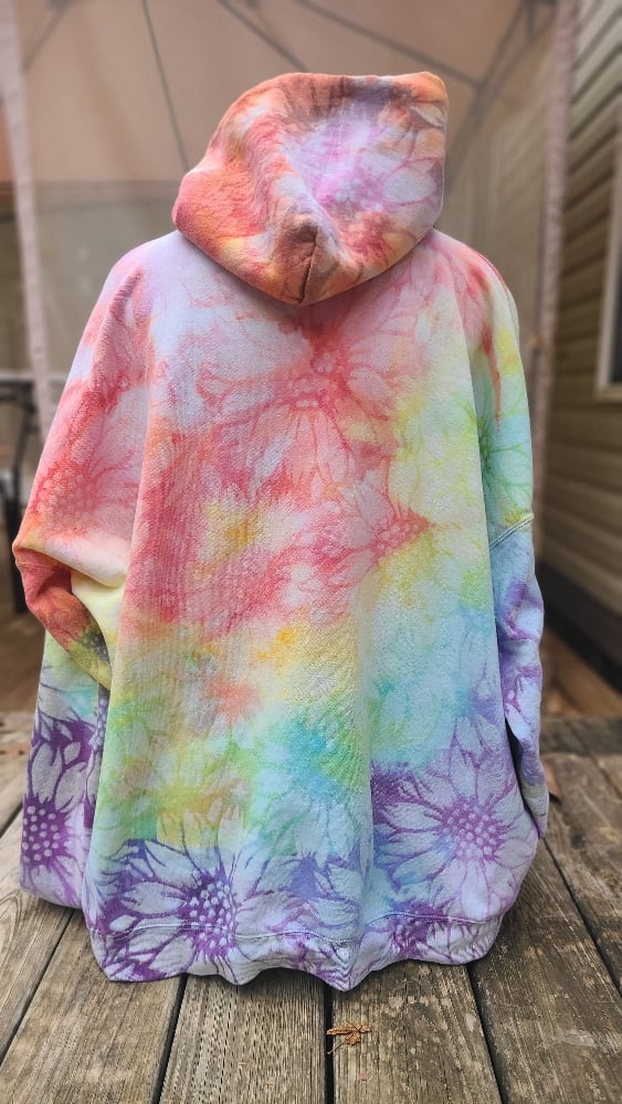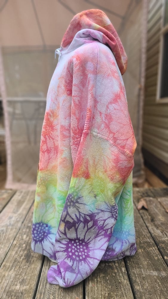 Gildan 50/50 polycotton blend hoodie dyed in rainbow colors with sunflowers peeking through