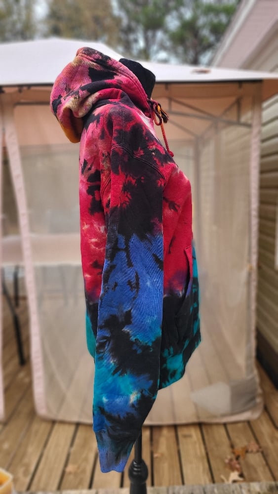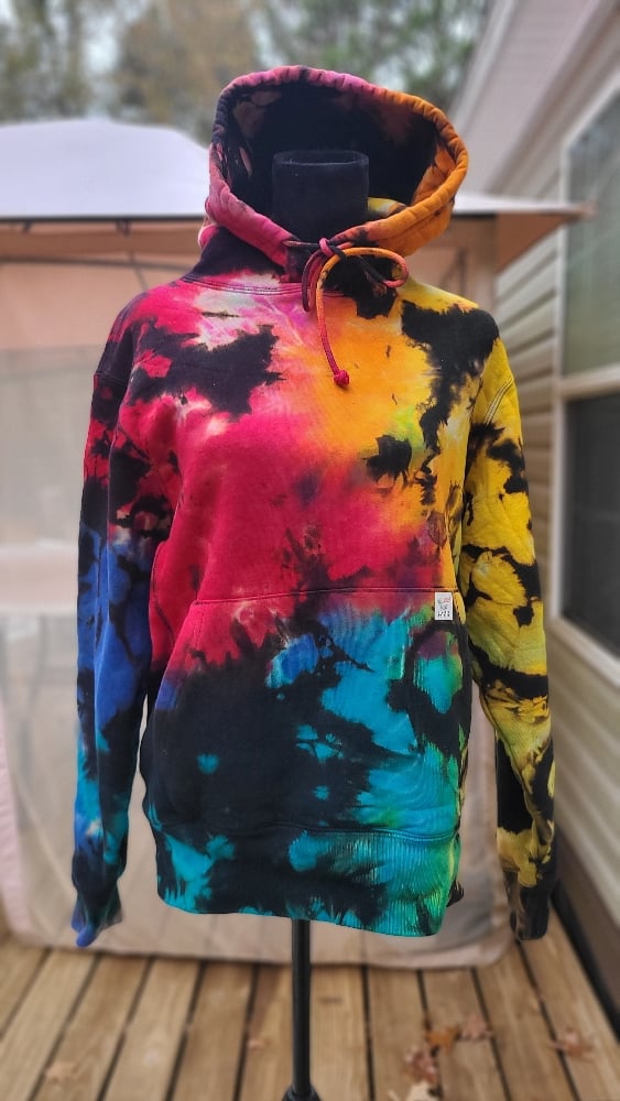 Bold. Electric. Unapologetically alive. Rainbow Road is a full-spectrum burst of color, a wild collision of neon blues, fire reds, hot pinks, golden yellows, and cosmic greens that blaze across a deep black backdrop. Every fold of the fabric caught pigment differently, creating a one-of-a-kind map of vibrant chaos — like racing through a technicolor universe at light speed.