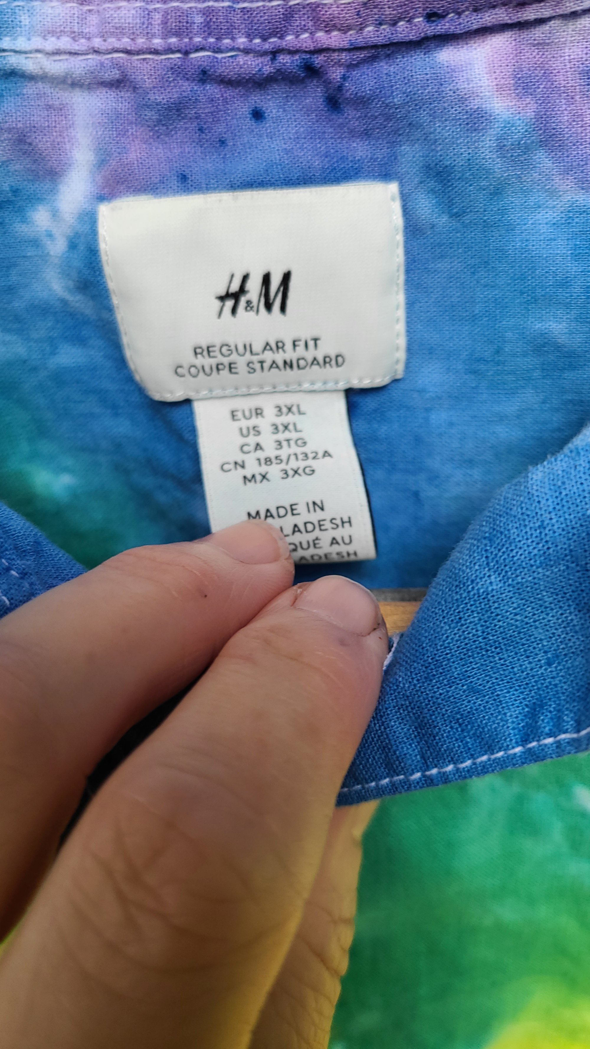 Step into a spectrum of color with this vibrant men’s button-down, reborn in a linen-cotton blend that breathes easy and wears effortlessly. Originally from H&M, this size 3X shirt carries a regular fit and a timeless silhouette, complete with a turn-down collar, chest pocket, and side-slit straight hem.