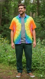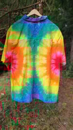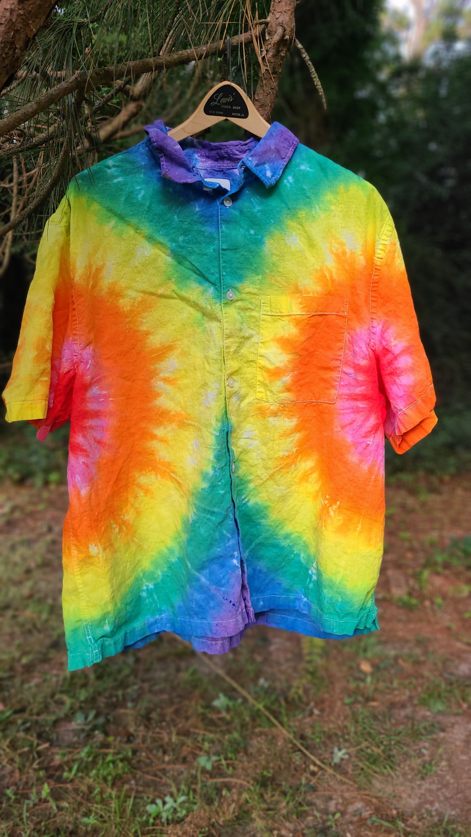 Its surface radiates in bold, hand-dyed tiedye—sunburst oranges, glowing yellows, and waves of emerald, turquoise, and violet—that create a retro-inspired aura with modern flair. Light and airy, it’s perfect for warm days, festival nights, or whenever you feel like turning life’s volume up to full color.