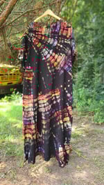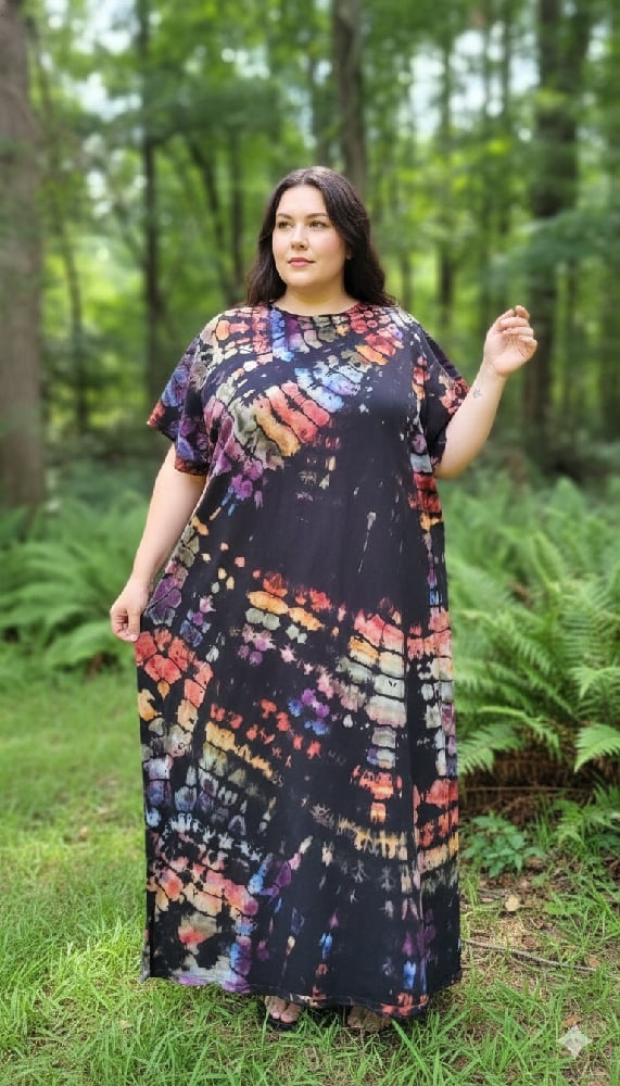 Unleash your free spirit in the Ripples of Rebellion – a one-of-a-kind vintage crew-neck maxi t-shirt dress that fuses comfort with a bold, tiedye edge. This eye-catching piece is a wearable canvas of fiery oranges, deep purples, and earthy tones rippling across a jet-black backdrop. Each swirl and streak tells its own story of rebellion, joy, and laid-back confidence.