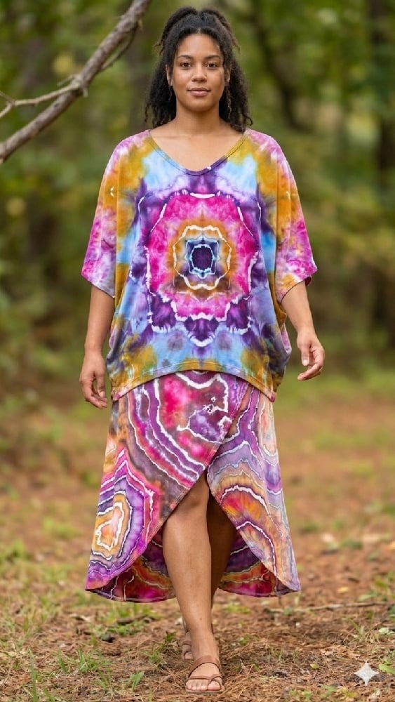 Step into a wearable masterpiece with the Ritual set. This set features a mesmerizing, earth-toned geode and mandala ice-dye design, blending deep amethysts, golden ochres, and sunset magentas. Crafted for those who value both high-art aesthetics and supreme comfort, these pieces transition effortlessly from a soulful day look to an enchanting evening ensemble.