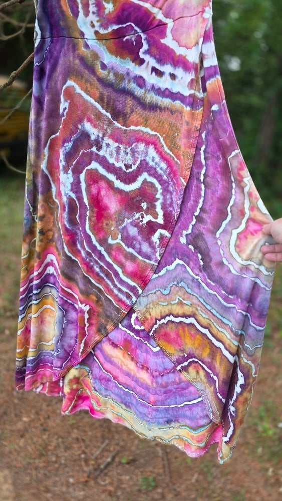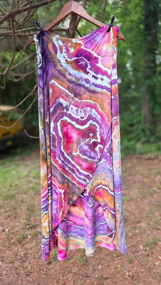 A stunning companion to the batwing top, this midi skirt features a sophisticated crossover front that creates a beautiful, layered petal effect. The intricate ice-dye rings mimic the natural beauty of a forest geode.