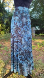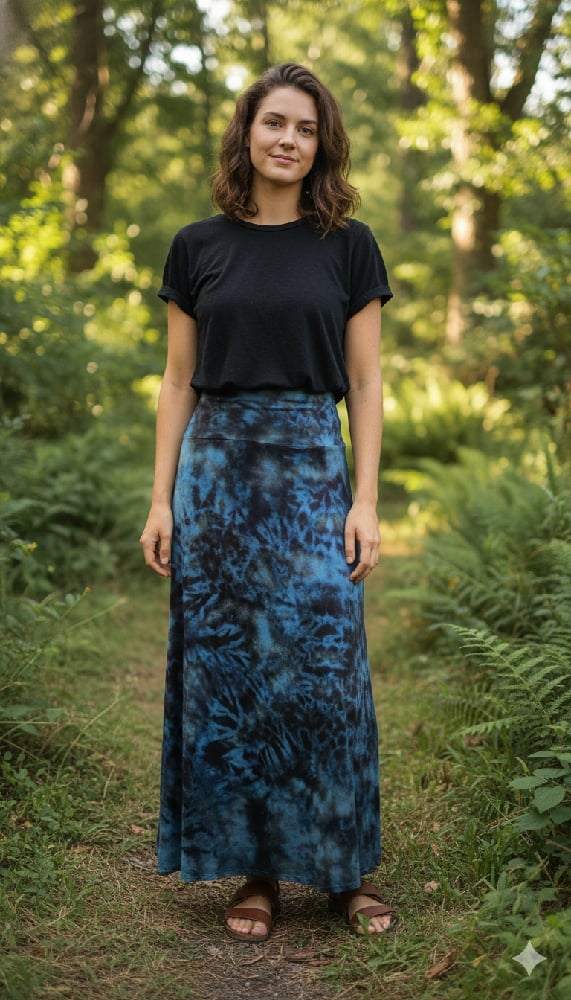 The high waist foldover band creates a versatile, flattering silhouette—wear it high for sleek sophistication or folded lower for relaxed styling. Its flowing maxi length drapes beautifully, while the deep interplay of inky blacks, stormy blues, and earthy ruddy undertones conjures the shadowy shimmer of raven wings at twilight.