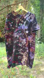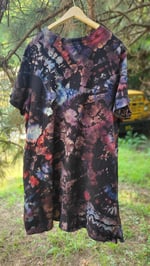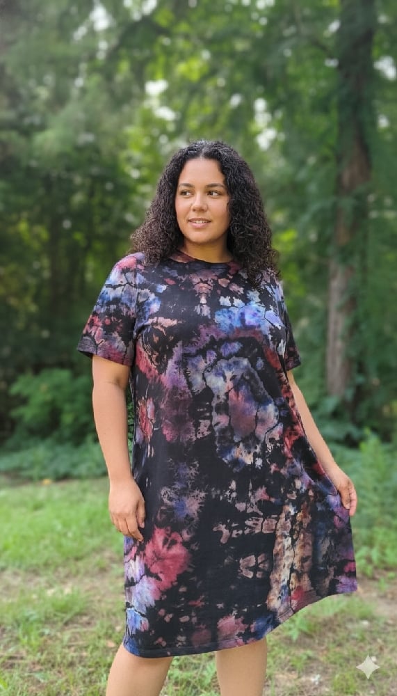 Mystic energy meets streetwear ease. This vintage-style t-shirt dress feels like it was pulled straight from an ancient spellbook—dyed in an alchemical swirl of deep sapphire, twilight purple, ash black, and ember red. Every mark looks like a secret waiting to be deciphered. It’s bold, powerful, and just a little arcane.