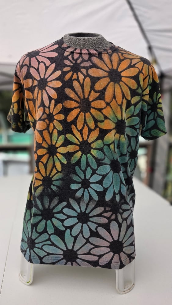 Unisex Large Tultex polycotton blend tee, stencil bleached with daisies and then dyed in a spring color palette