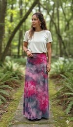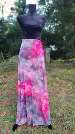 Swirled in striking shades of fuchsia, violet, and shadowy gray, the design feels like a secret garden lit by neon dusk—romantic yet untamed. With every step, this skirt catches light and movement, inviting intrigue wherever you go.
