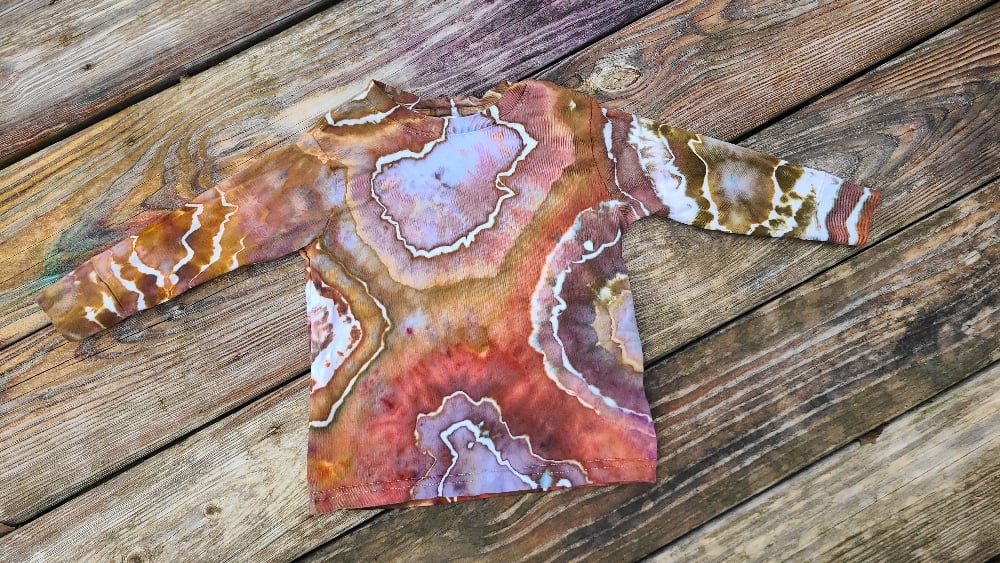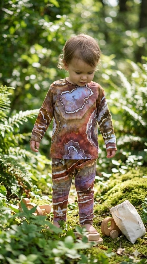 Wrap your little explorer in the grounding colors of nature with this stunning, one-of-a-kind geode tiedye set. Featuring a mesmerizing crystalline pattern, this outfit blends rich shades of rusty earth, warm amber, and deep amethyst purple, separated by striking white veins that mimic natural stone formations.